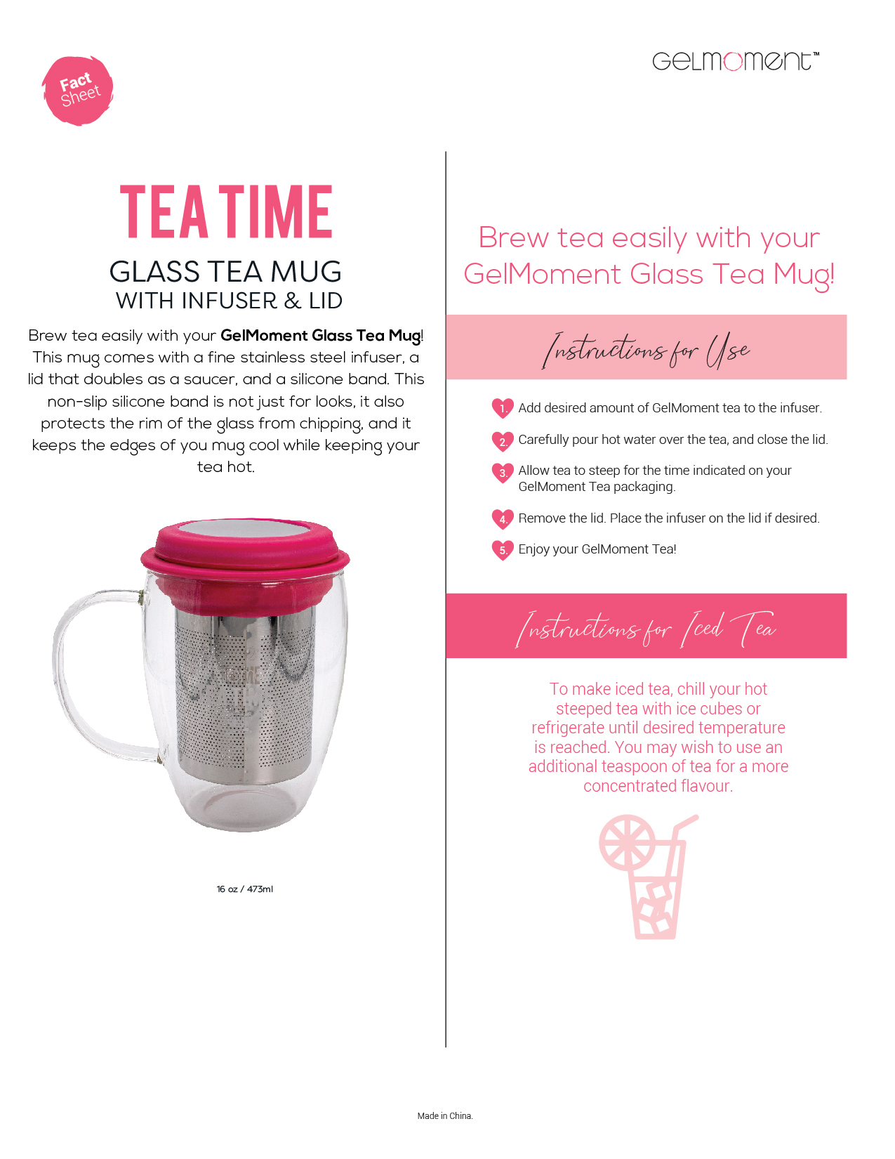 Brew tea easily with your GelMoment Glass Tea Mug! This mug comes with a fine stainless steel infuser, a lid that doubles as a saucer, and a silicone band. This non-slip silicone band is not just for looks, it also protects the rim of the glass from chipping, and it keeps the edges of your mug cool while keeping your tea hot!